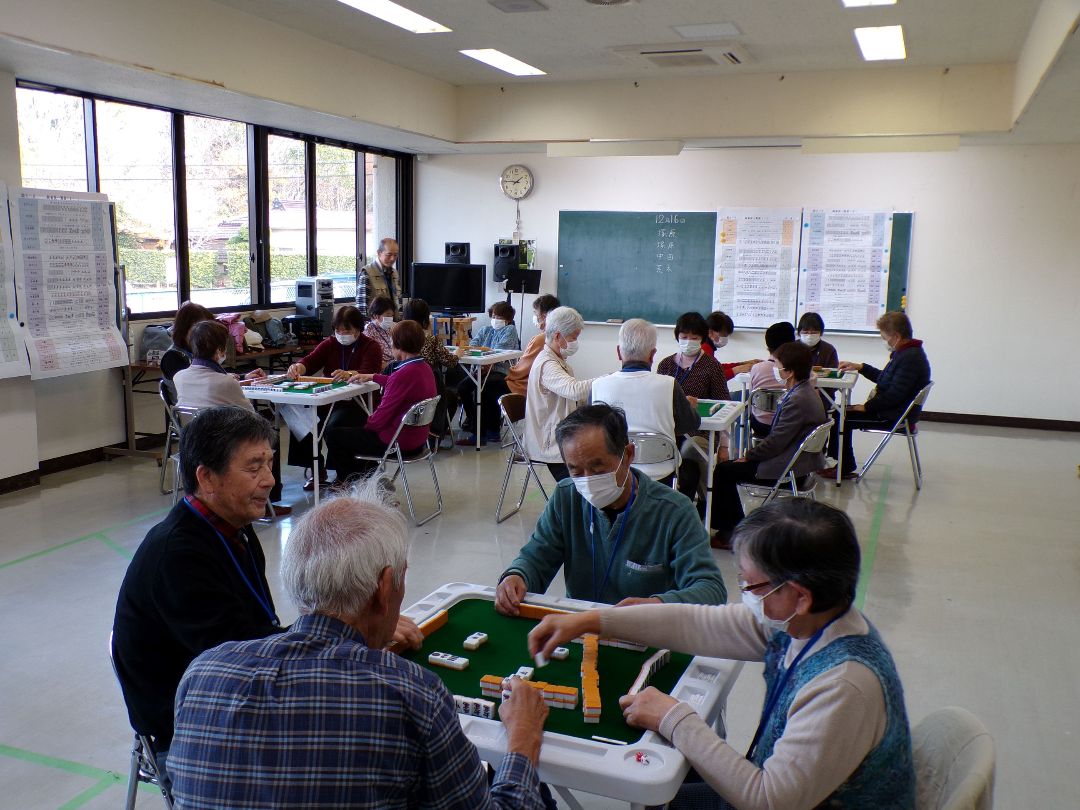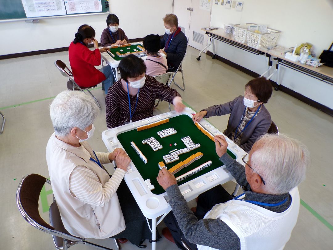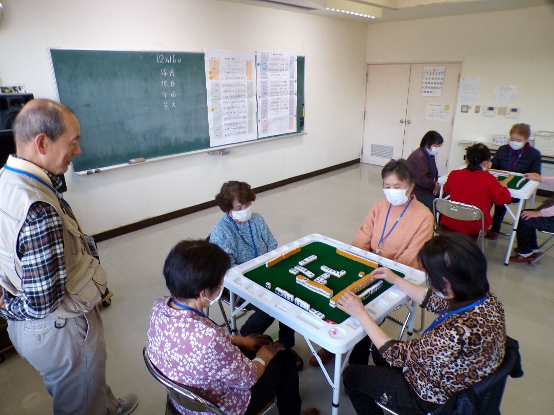 豊岡地区社会福祉協議会では「豊岡健康マージャン」を実施しています。マージャンをとおして、思考力、創造力、記憶力、コミュニケーション能力を醸成することを目指しています。マージャン未経験の方も、ゲームができるまで上達しました。(現在、新規の会員募集は行っていません。)